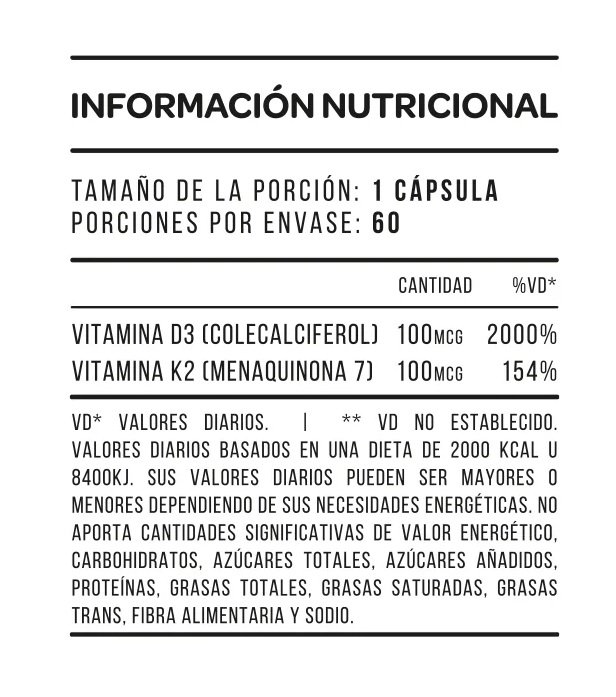La Vitamina D3 mejora la absorción intestinal de calcio, mientras que la Vitamina K2 es la responsable de llevar ese calcio hacia los huesos y evitar que se deposite en las arterias. En conjunto, te brindan una fórmula ideal para prevenir debilidad ósea, mejorar la densidad mineral y proteger tu sistema cardiovascular.