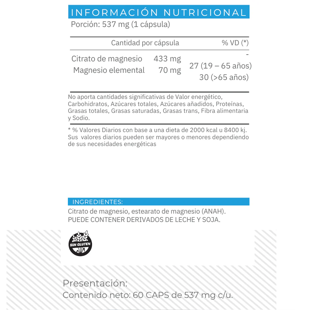 Citrato de Magnesio de alta absorción. Los excipientes pueden variar según la marca (consultar el rótulo de cada presentación).